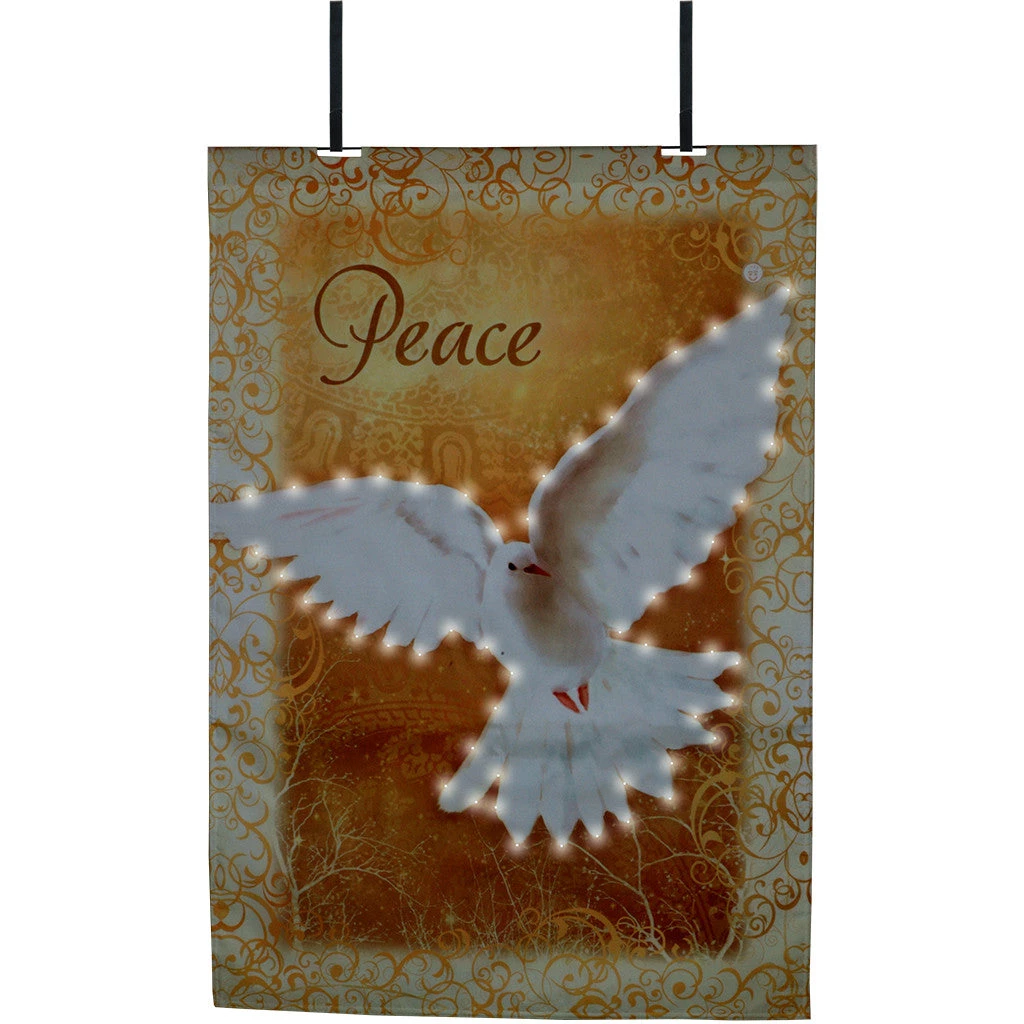 Brighten up your entrance for the Holidays! Hang our Holiday Door Flag over your front door and see how it illuminates. A switch device is stored in the back pocket. A pair of metal door hangers are included in the packaging. Requires three AA batteries (not included).
